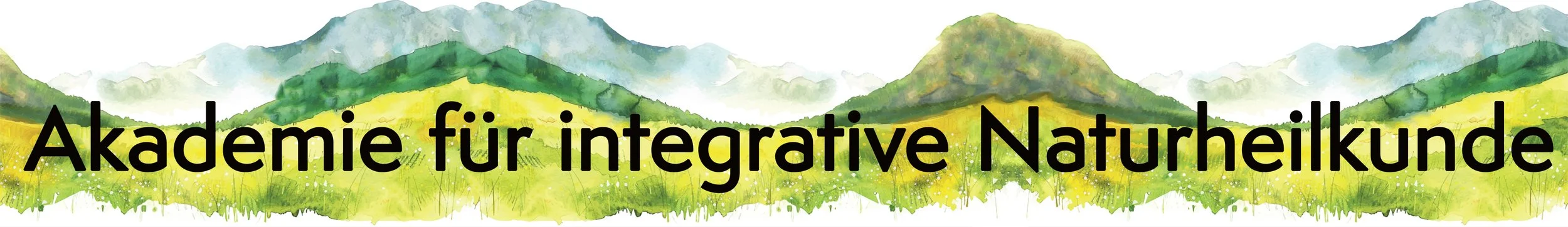 Ein Wasserfarben-Hintergrund mit grünen Bergen und Wiesen, darüber der schwarze Text 'Akademie für integrative Naturheilkunde'.
